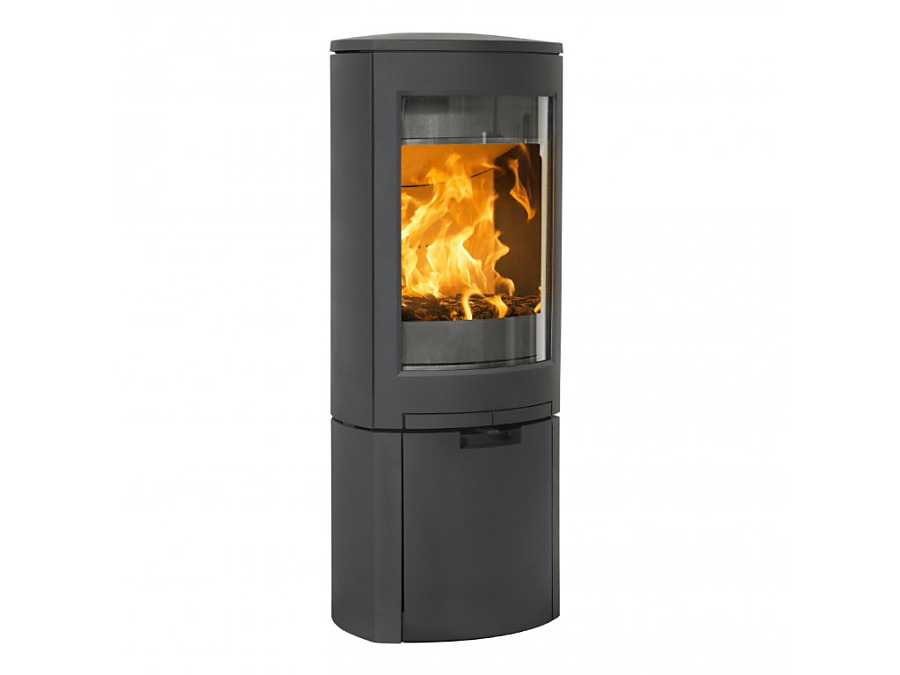 Jøtul F 368 Advance stojí na podstavci s liatinovými dvierkami. Moderné čisté línie od hora až dolu.