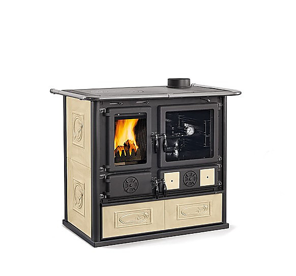 La Nordica celoliatinový sporák Rosa Liberty - s funkciou dvojitého spaľovania a kachľovým obkladom vo farebných verziách liberty bordó, mastenec a liberty pergamena, vyniká menším ohniskom z liatiny, pohyblivým roštom a väčšie rúrou na pečenie s teplomerom. Liatinová platňa má v mieste nad ohniskom odnímateľné kruhy, umožňujúce varenie na otvorenom ohni. Tak môže dilatovať, nedeformuje sa a ani nepraská. Vďaka preskleným dvierkam si môžete dopriať krásny pohľad na horiaci oheň a kontrolovať priebeh pečenia v rúre. Sporák má priestor na sušenie, rozmrazovanie a ohrievanie jedál. Sporáky majú jednoduché otváranie dvierok aj zásobníka dreva a presnú reguláciu primárneho a sekundárneho vzduchu. Dymovod možno pripojiť na pravej strane na platni alebo v zadnej časti.